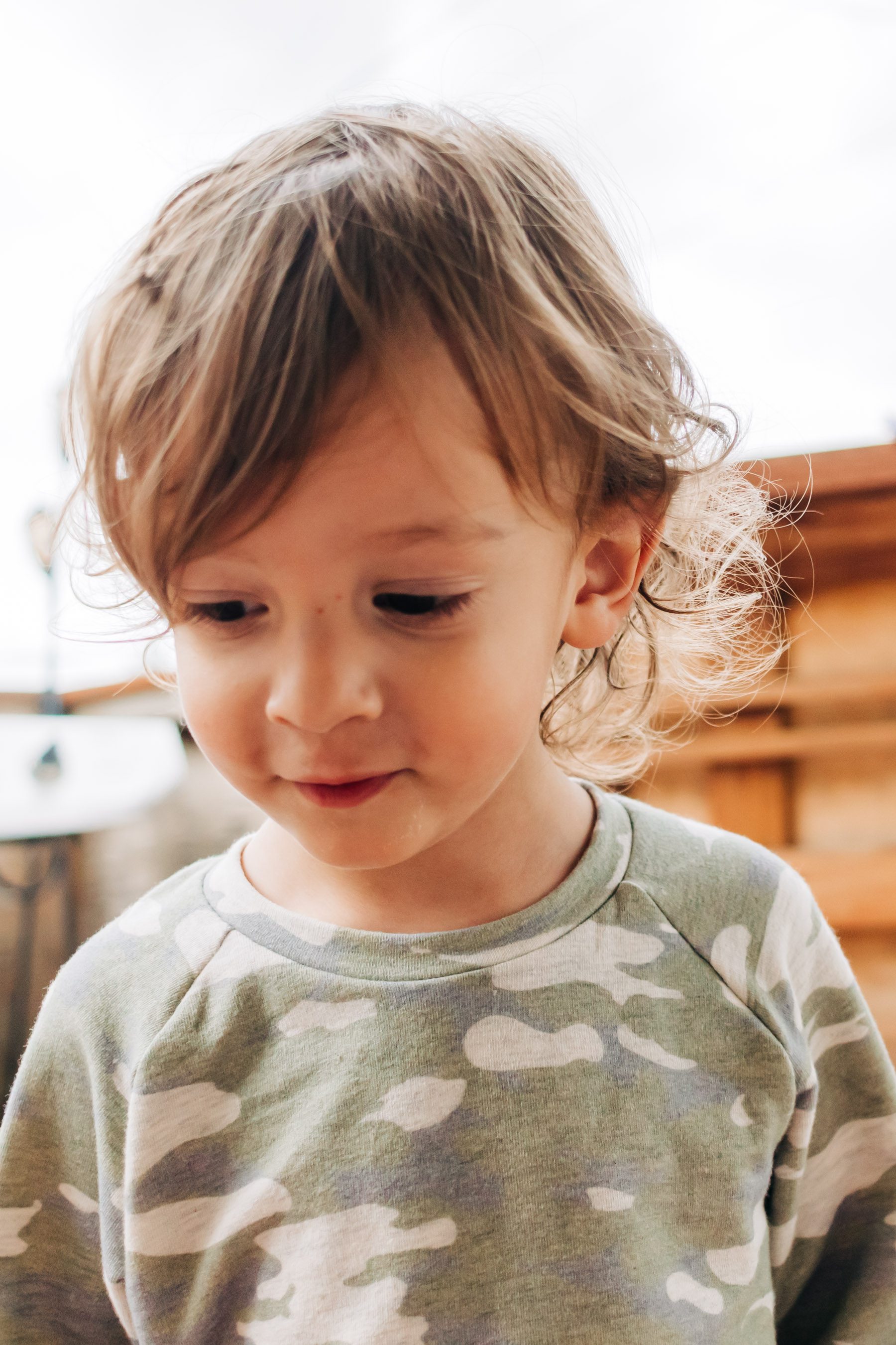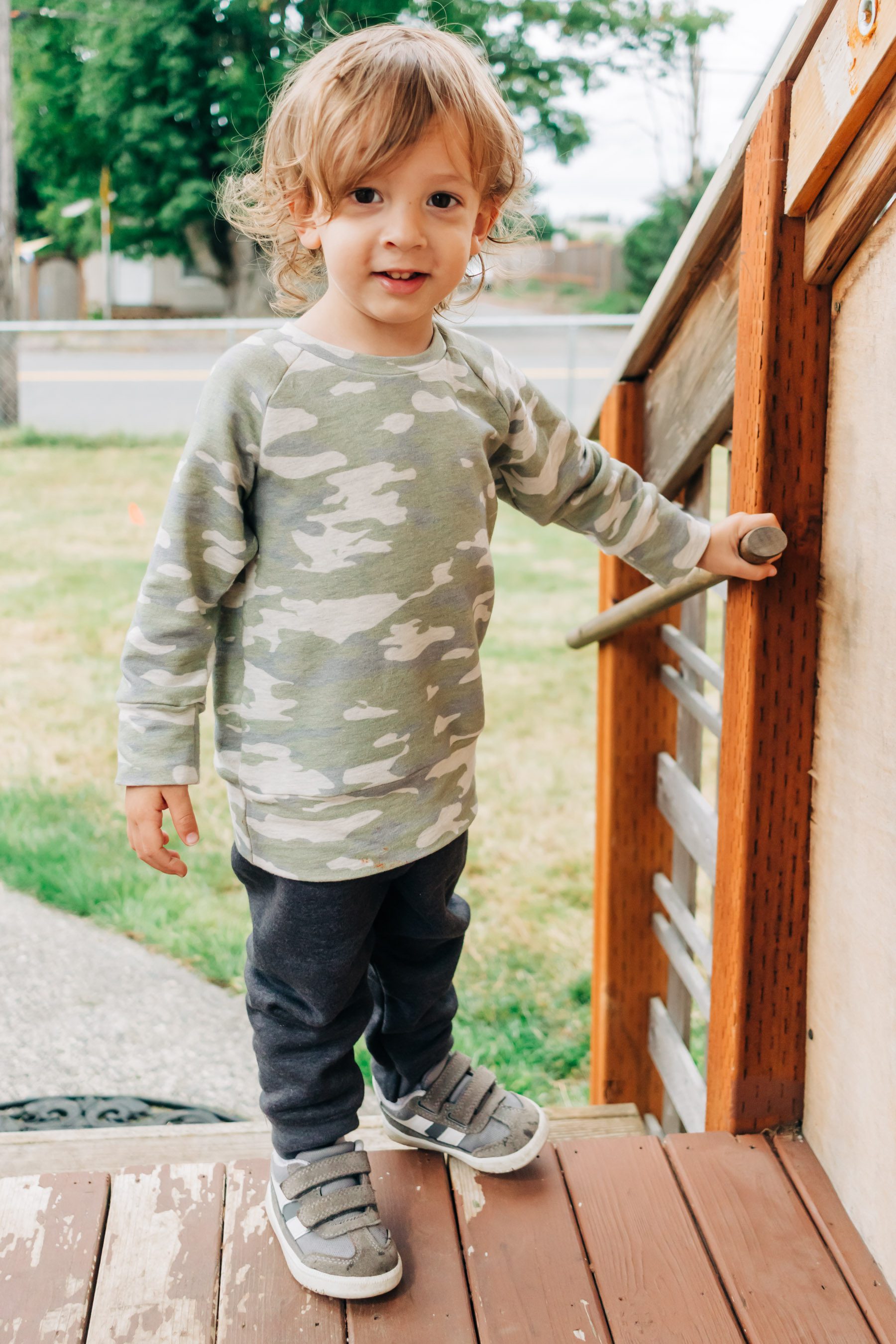 I bought a good amount of this gorgeous oatmeal camo fabric and already regret not having bought more! It suits him so well and I want to make all the things out of it. They’re sold out now, but I got it from Raspberry Creek Fabrics, which is one of my favorite places to get affordable cotton lycra jersey and french terry fabric.