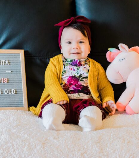 Zoe’s 8 month outfit keeps a wintery theme with shades of gray and subtle pink. She looks so cozy and comfy in it!